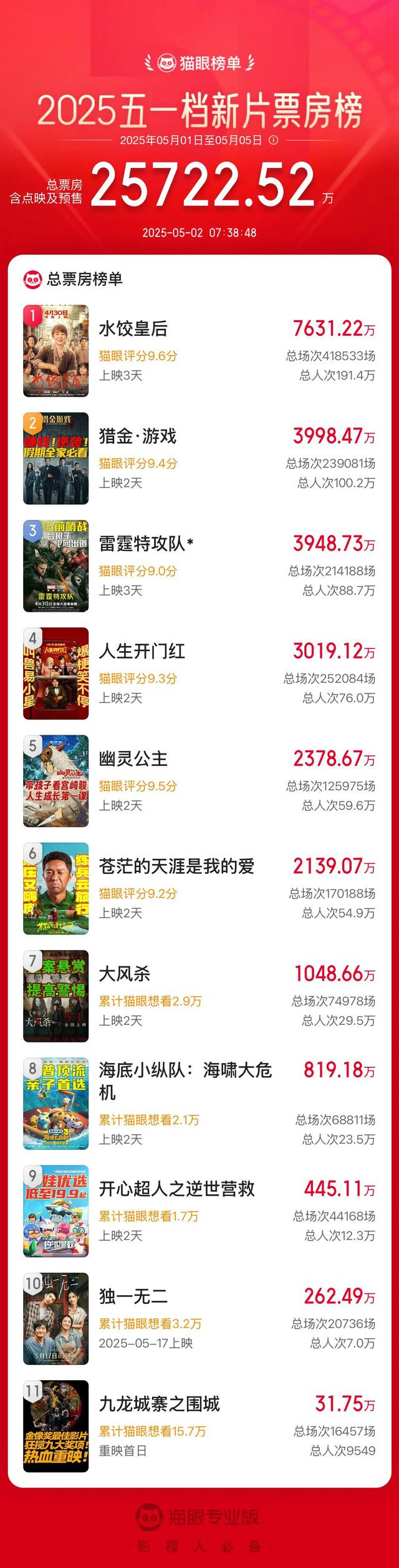 今年五一档上映的作品有《水饺皇后》《猎金游戏》《雷霆特工队》《人生开门红》《幽灵公主》《苍茫的天涯是我的爱》《大风杀》等作品。